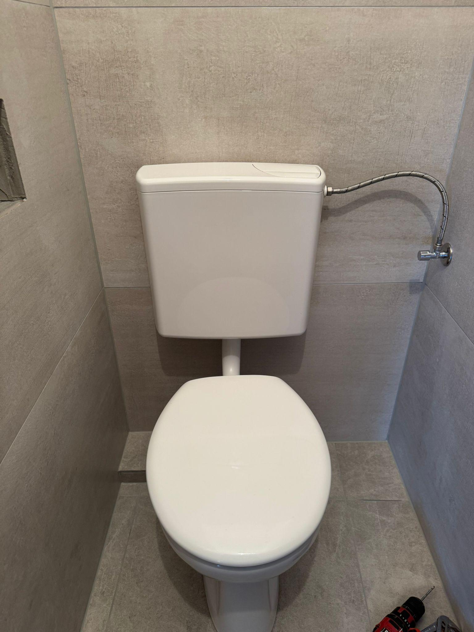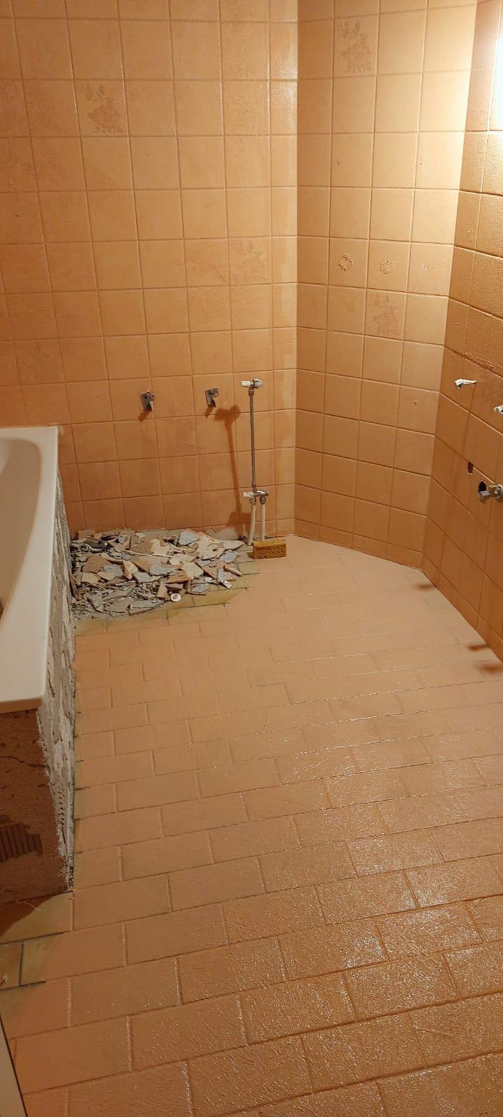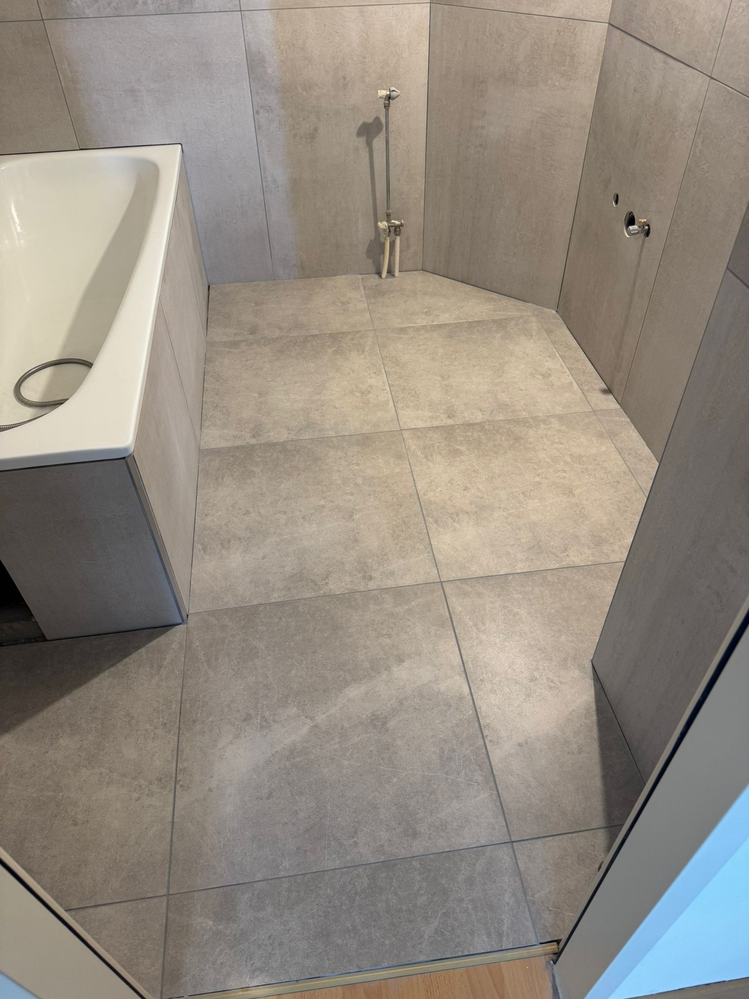 Wenn die Fliesen nicht mehr zeitgemäß sind, braucht es moderne. Wir verstehen das! Dieses Badezimmer wurde daraufhin gänzlich mit Fliesen in Betonoptik erneuert. Hier sehen Sie den Unterschied Vorher-Nachher: